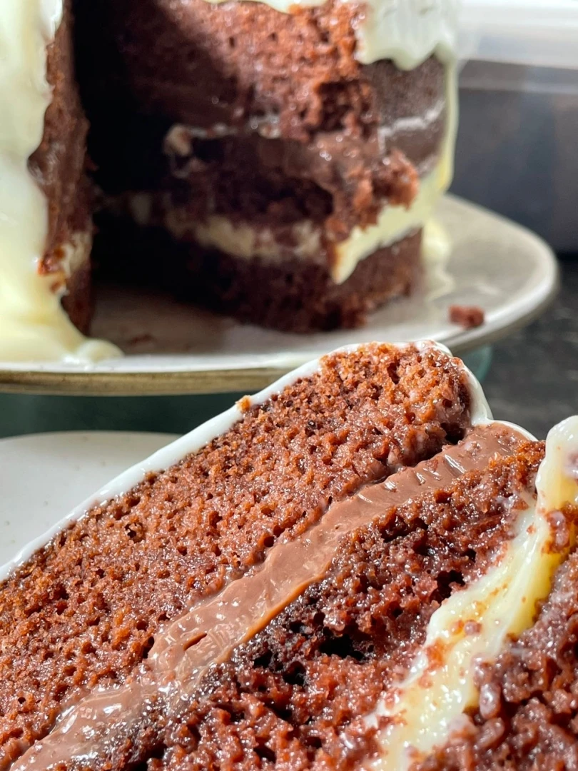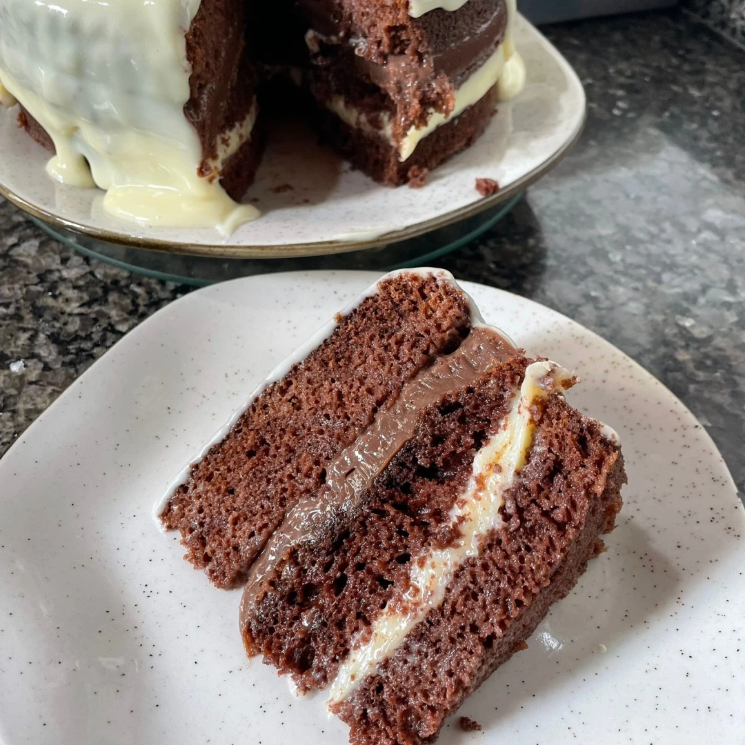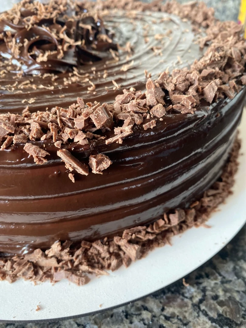 Bolo de chocolate recheado de brigadeiro e branquinho. 2.5kg Serve entre 20 a 25 fatias